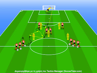Περιγραφή: Άσκηση συνεργασίας υποομάδων, με στόχο το σουτ. Η άσκηση εξελίσσεται σε 2 υποομάδες 6-8 παικτών, που τοποθετούνται όπως στο σχήμα. Συνεργασία 1 κεντρικού επιθετικού, 1 κεντρικού μεσοεπιθετικού και 1 εσωτερικού μέσου, για σχηματισμό 1-4-4-2 με ρόμβο ή 1-4-3-1-2. Εκτελείται εναλλάξ από αριστερά και δεξιά.
